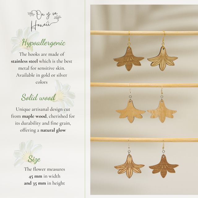 Surprise your loved ones or yourself with our unique Naupaka Wood Earrings – a perfect gift for those who appreciate the Hawaiian beauty of island-inspired jewelry. Precision-cut from solid maple wood and measuring 45 x 35 mm, the flower captures the genuine charm of Naupaka. The earrings feature hypoallergenic stainless steel hooks in gold or silver. Note that each wood piece is unique and may slightly differ from the product image due to its handmade nature, bringing subtle variations.
